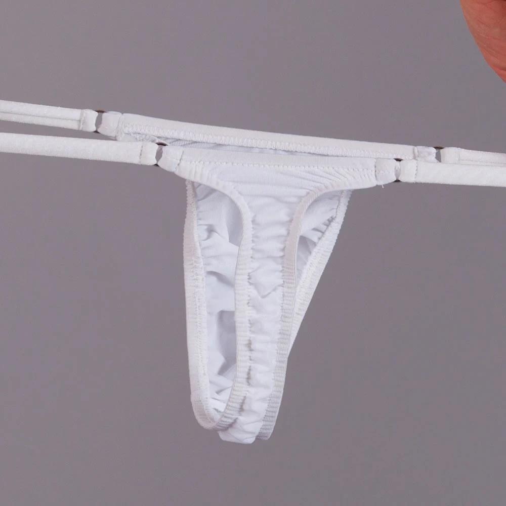 Unsere Exklusiv – Serie zeichnet sich durch einen erstklassigen Tragekomfort aus. Im Vergleich zu unseren regulären String Tangas hat dieser schöne Men String Tanga einen elastischeren Beutel und die Einfassung ist Dank der Zick Zack – Naht deutlich flacher bzw. unauffälliger. Auch der Übergang vom Beutel zum Steg, welcher durch den Po verläuft, ist nahtlos. Du wirst dieses einzigartig gute Tragegefühl lieben! Dieser String ist nicht nur ein idealer Badestring, sondern auch als Unterwäsche perfekt geeignet! Der schlichte weiße Stoff ist schön transparent und super elastisch.